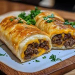 These Garlic Butter Beef Cheeseburger Rollups are a warm, simple dish that fits busy weeknights and easy parties. You can make them with few steps and feel proud when you serve them. Ground beef cooks fast with garlic and onions. Butter gives the filling a rich, smooth taste. Cheese melts into the meat so each bite is soft and gooey. The crescent dough wraps the mix and bakes to a golden crust that kids and adults like. You can change the cheese and add a little sauce to fit your taste. Make the meat mix ahead and heat it before you roll so you save time. These rollups pair well with a simple salad or a cup of soup for a full meal. They also match many sides like fries or steamed vegetables. If you enjoy a garlic and cheese combo, check this similar idea for a different twist: garlic parmesan cheeseburger bombs. The recipe that follows uses easy pantry items and clear steps. It will be a go-to when you want something fast, tasty, and filling. Follow the simple steps and you will have hot, savory rollups ready to eat in under thirty minutes. Every bite will please.